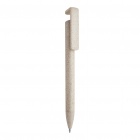 Długopis na klik wykonany z włókna pszenicznego i plastiku ABS. Posiada szeroki, duży klips ułatwiający znakowanie, który dodatkowo może służyć jako podstawka pod telefon. Wkład w kolorze niebieskim.