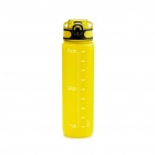 Butelka z tworzywa Tritan posiada półprzezroczysty korpus i dopasowaną zakrętkę z praktycznym uchwytem do przenoszenia. Na ściance znajdują się wskazówki dotyczące nawodnienia oraz oznaczenie pojemności, co ułatwia kontrolę przyjmowanej ilości płynów. Produkt łączy użyteczność z estetyką.