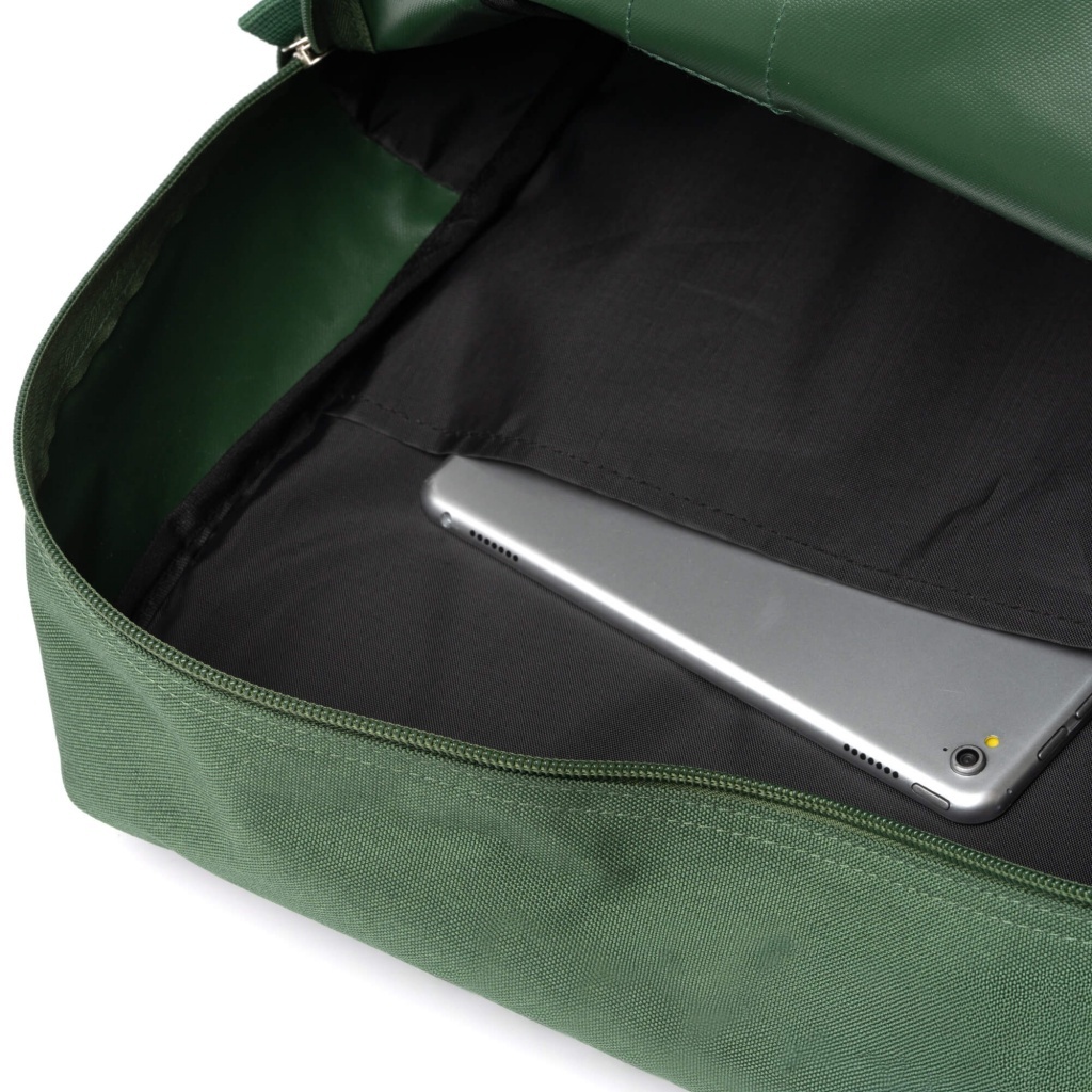 Plecak uszyty z poliestru 600D pochodzącego z recyklingu, z główną komorą. W środku znajduje się kieszeń na laptopa o przekątnej do 16 cali. Z przodu zamykana na zamek błyskawiczny przednia komora, na górze podwójny uchwyt do przenoszenia, a całość uzupełniają wyściełane szelki i tylny panel.