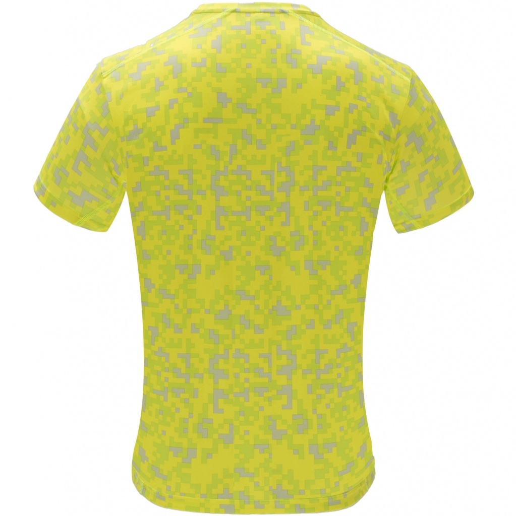 Techniczna koszulka we wzorki z krótkim rękawem z okrągłym dekoltem. Posiada wzmocnione, kryte szwy na karku w kolorze fluorescencyjnym oraz boczne i pachowe panele w tym samym kolorze.
