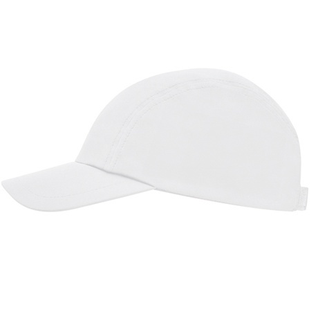 Techniczna czapka z daszkiem, 3 panele. Lekka i oddychająca tkanina. Tylne regulowane zapięcie na rzep. Przednia część czapki przeznaczona do nadruku.