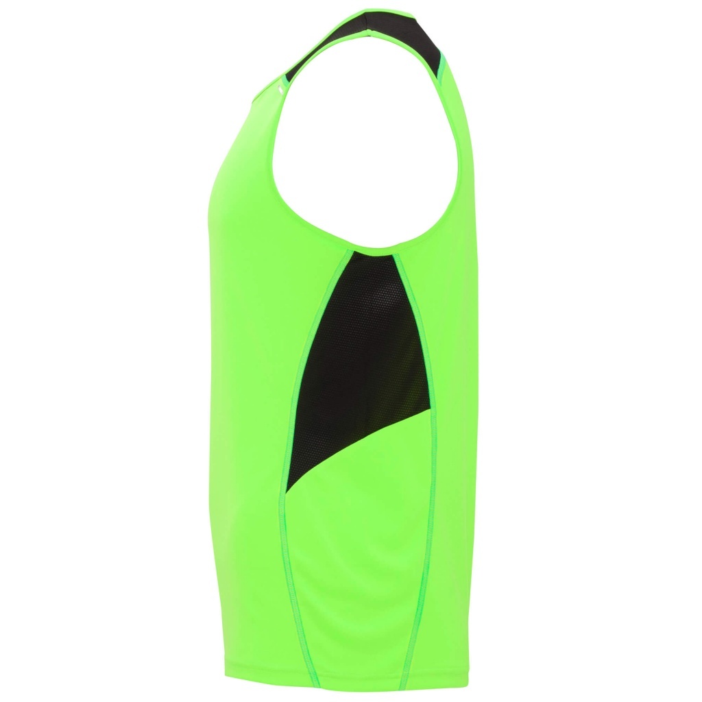 Koszulka techniczna na ramiączka wzbogacona o elementy odblaskowe. Posiada okrągły kołnierzyk oraz wzmocnione, kryte szwy na karku. Trójkolorowy model wykonany z dwóch materiałów poliestrowych: główna tkanina interlock oraz boczne i górne panele z mikroperforowanej tkaniny. Model szybkoschnący i łatwy w pielęgnacji.