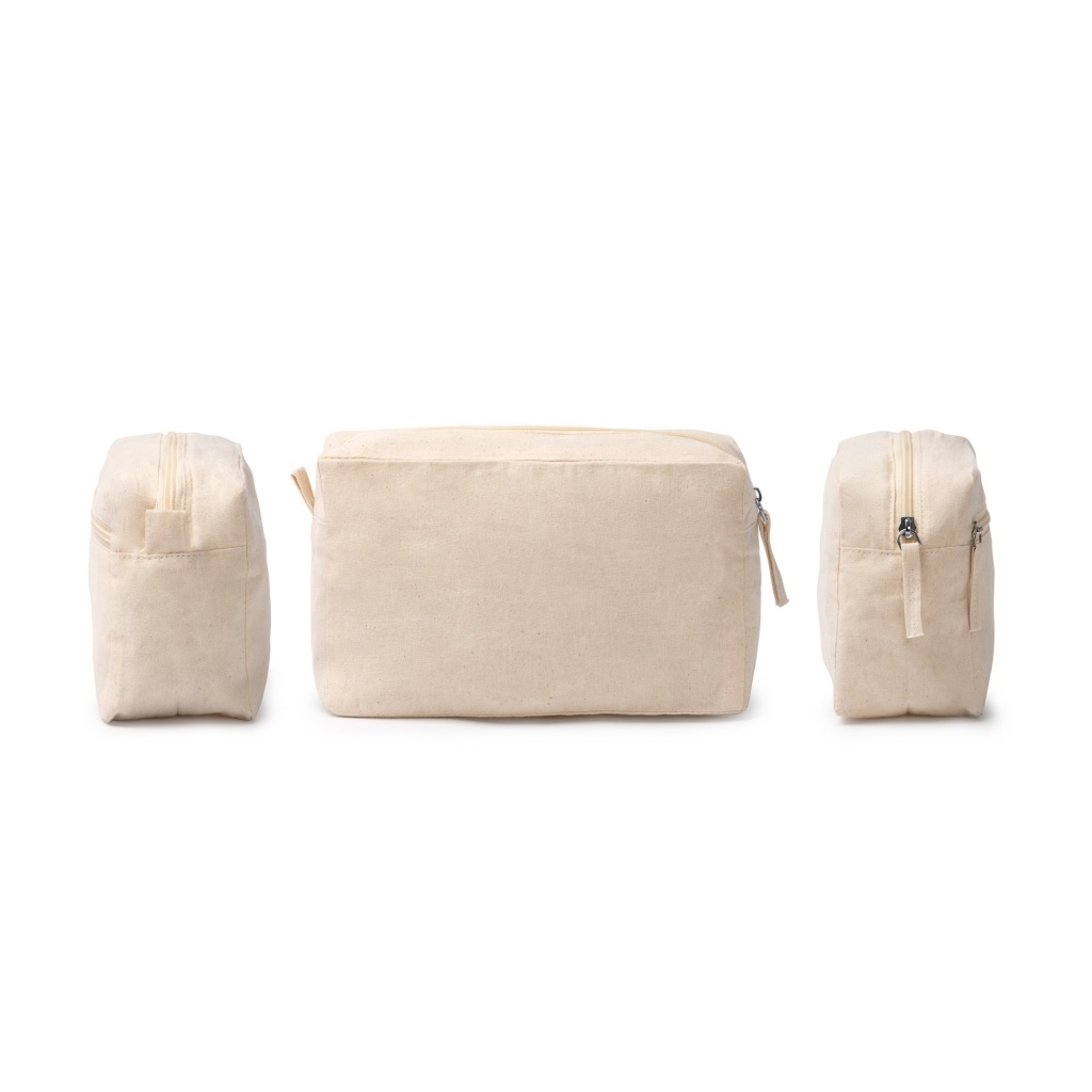 Kosmetyczka uszyta w 100% z bawełny o gramaturze 150 g/m², zapinana na zamek błyskawiczny. Posiada dwie kieszenie: główną i boczną.