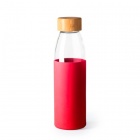 Elegancki szklany bidon wyposażony w bambusową nakrętkę oraz kolorową silikonową osłonę.