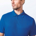 Koszulka polo z krótkim rękawem. Zapięcie na trzy guziki. Prążkowany kołnierz. Wzmocnione, kryte szwy w kołnierzu i na ramionach.