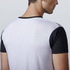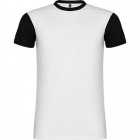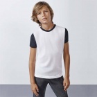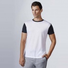 T-shirt z krótkim rękawem, zaokrąglony kołnierzyk wykończony lamówką w kolorze czarnym. Rękawki w kolorze czarnym wykonane z tego samego materiału. Koszulka wykonana z tkaniny poliestrowej przypominającej w dotyku bawełnę.