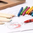 Zestaw dziecięcy zawierający notatnik z 8 arkuszami z różnorodnymi rysunkami do kolorowania, 10 kolorowych kredek oraz 10 drewnianych kredek przeznaczonych do zabawy dla najmłodszych.