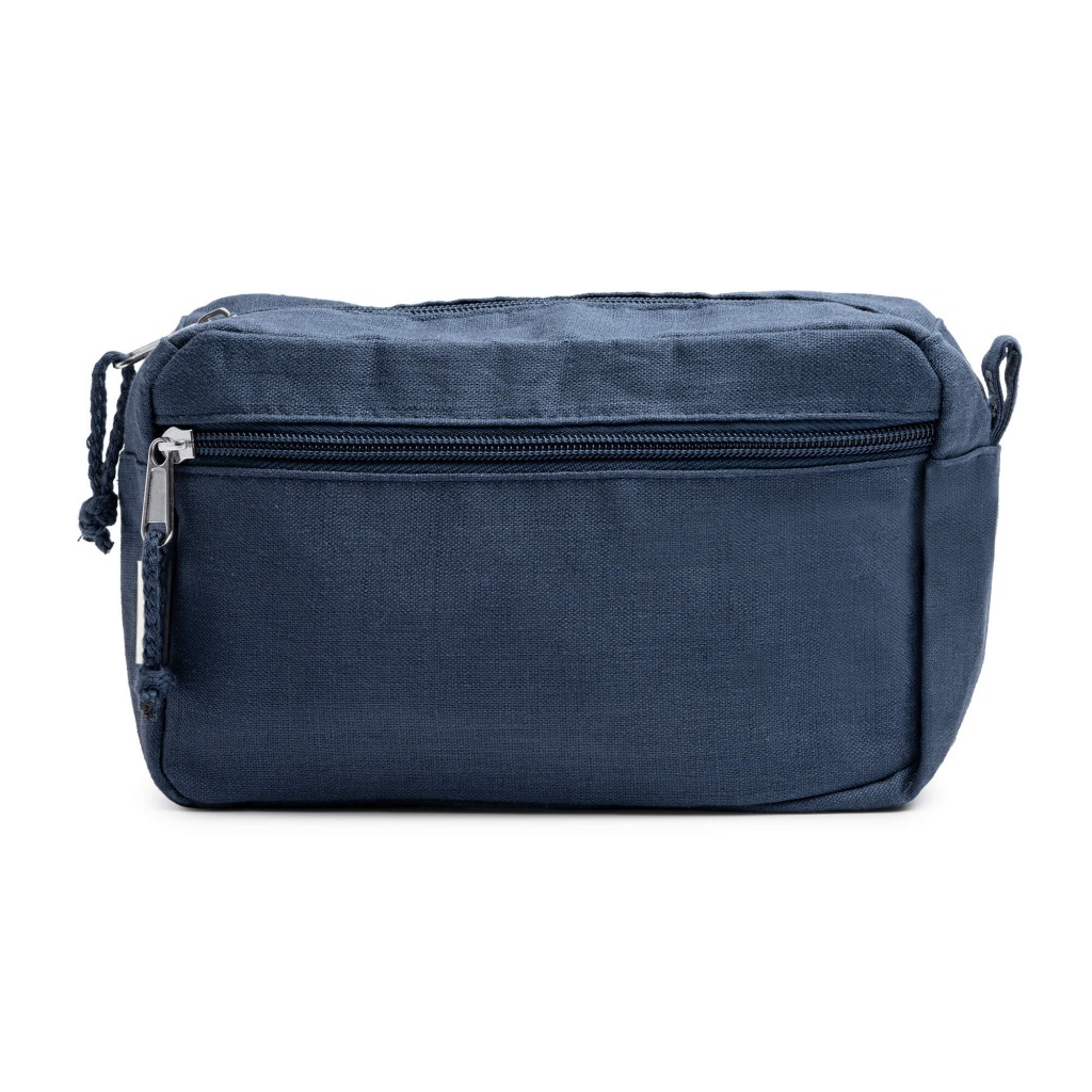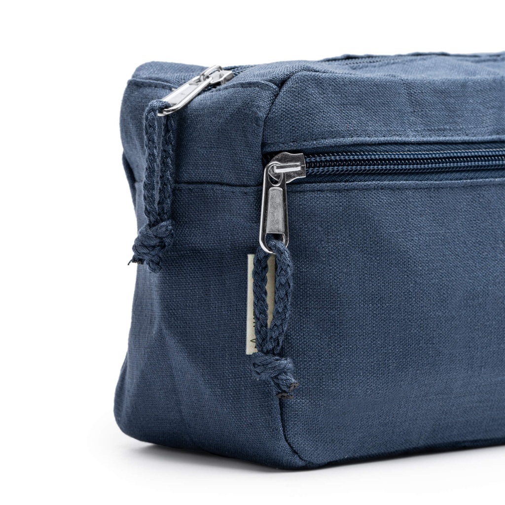 Wielofunkcyjna kosmetyczka uszyta w 100% z tkaniny konopnej (gramatura: 200 g/m²), wyposażona w dopasowany ściągacz.