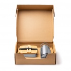 Pudełko na lunch ze stali nierdzewnej 304 o pojemności 800 ml, z bambusową pokrywką i elastyczną opaską zabezpieczającą. W zestawie bambusowe sztućce. Butelka ze stali nierdzewnej 304 o pojemności 500 ml.