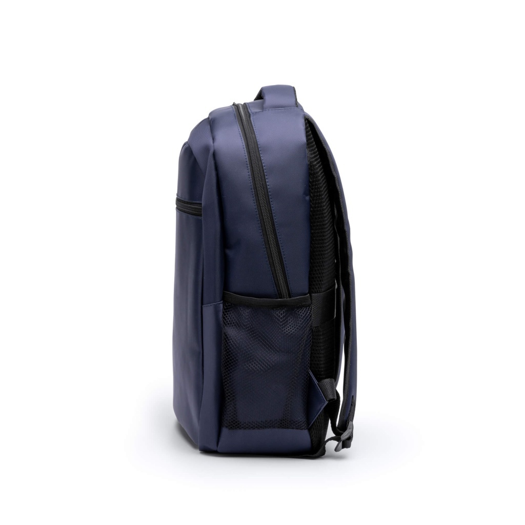 Plecak Executive wykonany z nylonu z recyklingu. Posiada pojemną główną komorę oraz wyściełaną kieszeń na laptopa o przekątnej 15 cali. Wyposażony w jedną kieszeń zewnętrzną i dwie boczne, wyściełane plecy i szelki oraz pasek do mocowania.