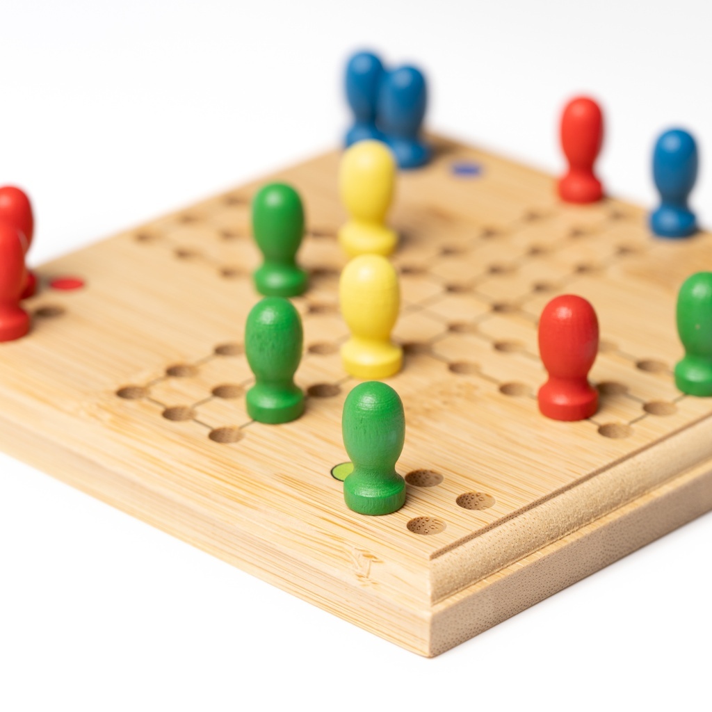 Zestaw do gry parcheesi (chińczyk) wykonany z bambusa. W komplecie plansza, kostka oraz 16 płytek w czterech kolorach. Dołączone bawełniane etui. Zapakowany w opakowanie zaprojektowane z myślą o środowisku.