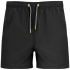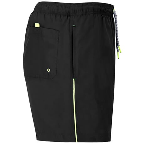 Krótkie spodenki plażowe z dwoma kieszeniami bocznymi. Pas elastyczny z kontrastującym, regulowanym sznurkiem oraz metalowymi oczkami przy kieszeniach. Boczne kieszenie obszyte lamówką. Tylnia kieszeń posiada otwór odpływowy.