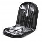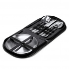 Zestaw zawiera: 2 łyżki, 2 widelce, 2 noże, nóż z ząbkowanym ostrzem oraz 2 talerze.