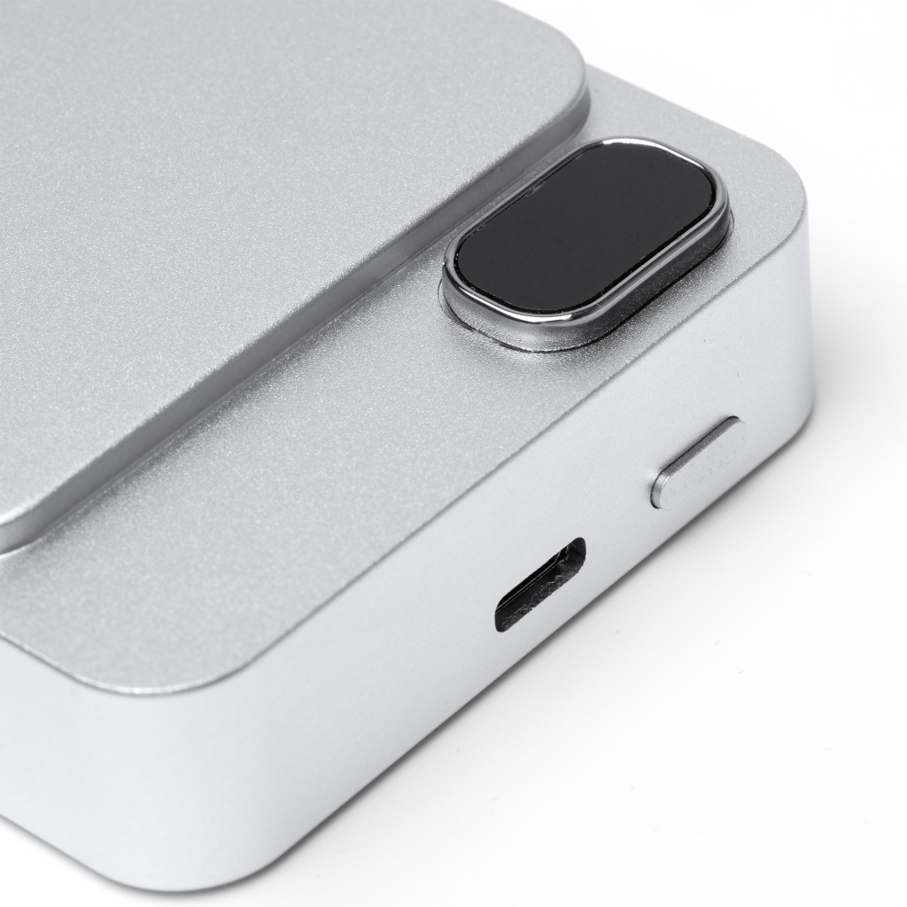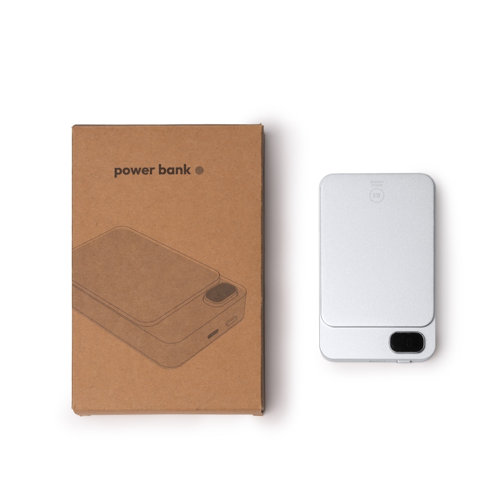 Magnetyczny powerbank o pojemności 10000 mAh z funkcją ładowania bezprzewodowego. Wyposażony w ekran wskazujący poziom naładowania. Korpus wykonany z aluminium z recyklingu.
