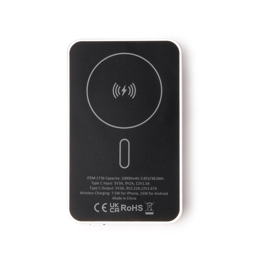 Magnetyczny powerbank o pojemności 10000 mAh z funkcją ładowania bezprzewodowego. Wyposażony w ekran wskazujący poziom naładowania. Korpus wykonany z aluminium z recyklingu.