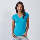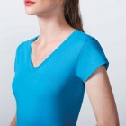 Damska koszulka z krótkim rękawem i dekoltem wykończonym w szpic (V-neck). Szwy boczne. Dopasowany krój.