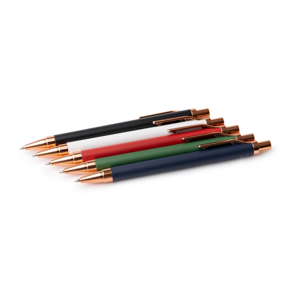 Długopis z aluminium pochodzącego z recyklingu, o matowym, jednolitym wykończeniu z miedzianymi detalami. Wyposażony w duży wkład z niebieskim atramentem, zapewniający płynne pisanie i dłuższe użytkowanie.