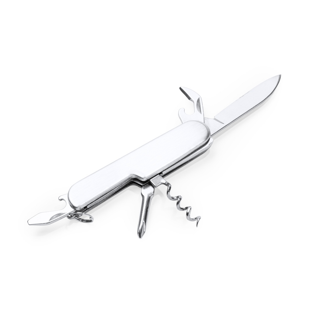 Wielofunkcyjny scyzoryk ze stali nierdzewnej z 6 funkcjami: nóż, otwieracz do butelek, otwieracz do puszek, korkociąg, śrubokręt i brelok do kluczy.