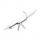 Wielofunkcyjny scyzoryk ze stali nierdzewnej wyposażony w 6 funkcji: nóż, otwieracz do butelek, otwieracz do puszek, korkociąg, śrubokręt oraz brelok do kluczy.