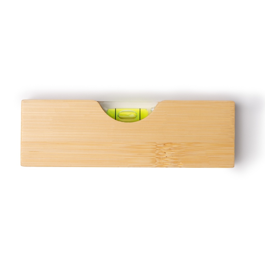 Poziomica wykonana z bambusa, posiadająca w korpusie wbudowany metalowy otwieracz do butelek.