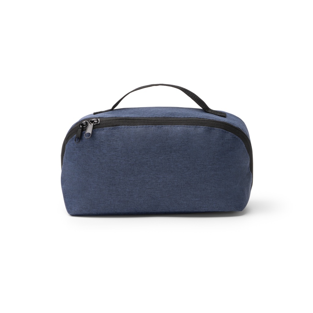 Kosmetyczka uszyta z tkaniny RPET 600D, zamykana ukośnym zamkiem błyskawicznym. Główna komora o dużej pojemności otwiera się pod kątem 180 stopni; wyposażona jest w niezależną kieszeń zapinaną na zamek, pełniącą funkcję przegrody, oraz dodatkową kieszeń z siatki z elastycznym ściągaczem.