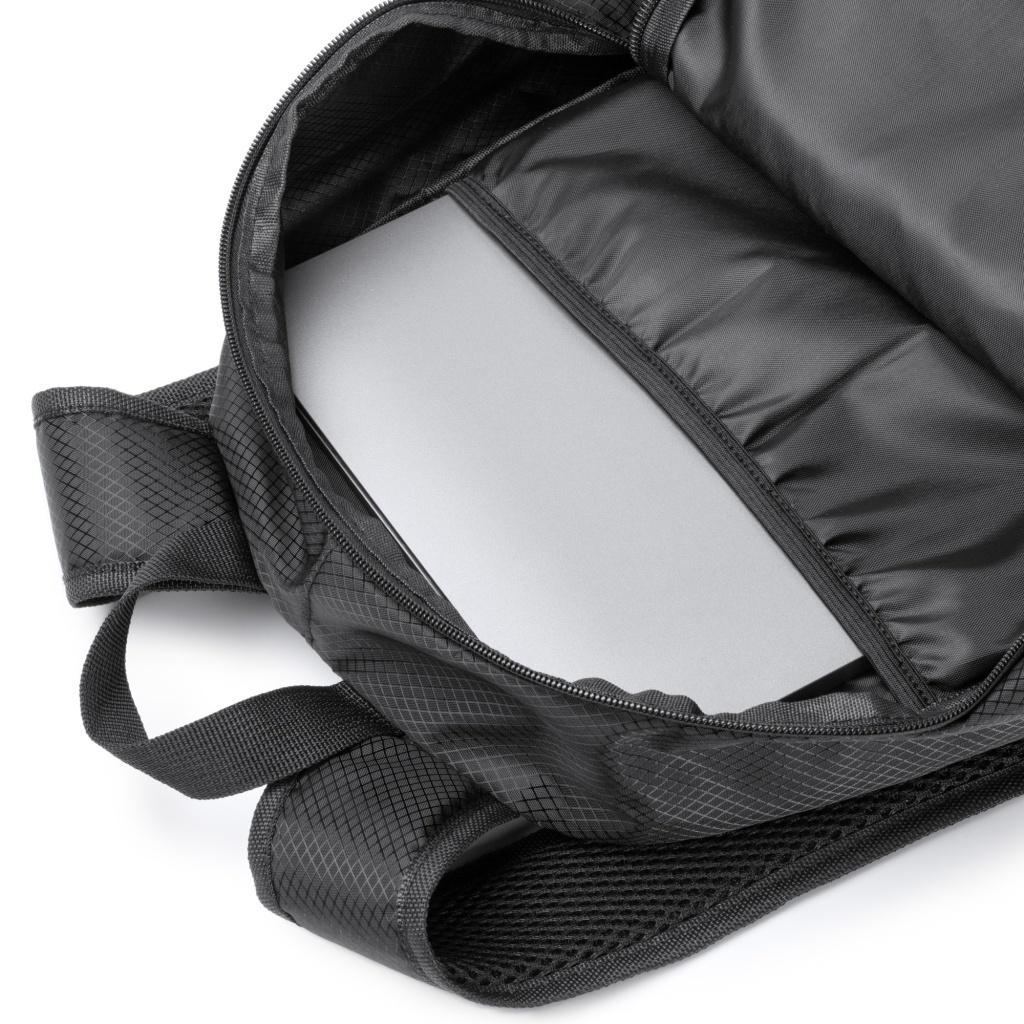 Plecak wykonany z hydrofobowej tkaniny RPET Ripstop. Wyposażony w komorę główną zamykaną na zamek błyskawiczny oraz wewnętrzną kieszeń z elastycznym ściągaczem, przeznaczoną do przenoszenia urządzeń z ekranem do 9 cali. Posiada dwie przednie, zewnętrzne komory zapinane na zamek oraz boczną kieszeń z elastycznym ściągaczem idealną na butelkę lub termos. Wyściełane szelki i tylny panel zapewniają wygodę i lekkość noszenia.