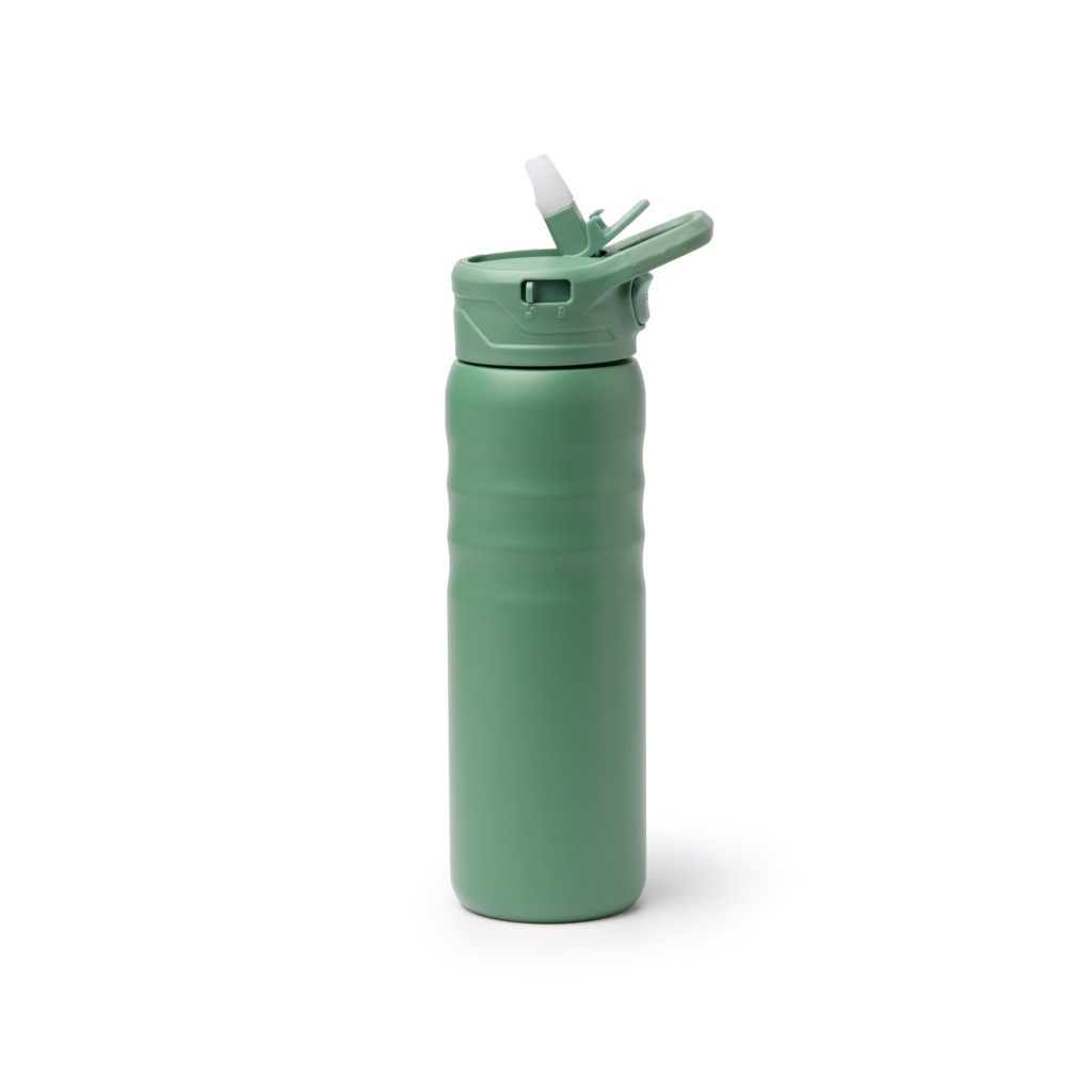Butelka termiczna z podwójnymi ściankami, wykonana z recyklingowanej stali nierdzewnej 304. Pojemność: 710 ml. Pokrywka z rozkładaną słomką, wyposażona w silikonową powłokę, osobne zamknięcie oraz system automatycznego otwierania sterowany przyciskiem. W zestawie znajduje się blokada otwarcia pokrywki oraz system zapobiegający kapaniu — dzięki silikonowej powłoce i pierścieniowi wbudowanemu w szyjkę butelki. Pokrywka posiada także praktyczny uchwyt do przenoszenia.