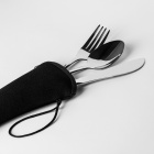 Praktyczny zestaw sztućców ze stali nierdzewnej w neoprenowym etui zapinanym na suwak. Zestaw zawiera widelec, nóż oraz łyżkę.