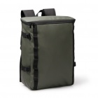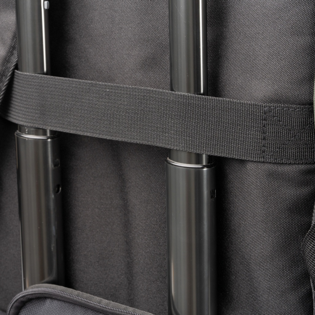 Plecak zewnętrzny wykonany ze skóry PU i wytrzymałego poliestru 600D, wyposażony w dużą komorę główną zamykaną na zamek błyskawiczny oraz wewnętrzną kieszeń z elastycznym ściągaczem na laptopa o przekątnej do 16 cali. Z przodu ukryta kieszeń zewnętrzna, po bokach sześć punktów zaczepienia, regulowane paski boczne do dopasowania objętości oraz pasek do mocowania dla większej wygody. Wyściełane plecy i szelki zapewniają komfort noszenia.