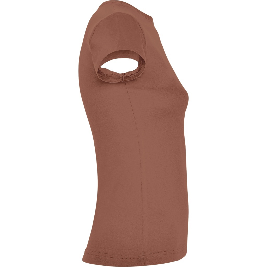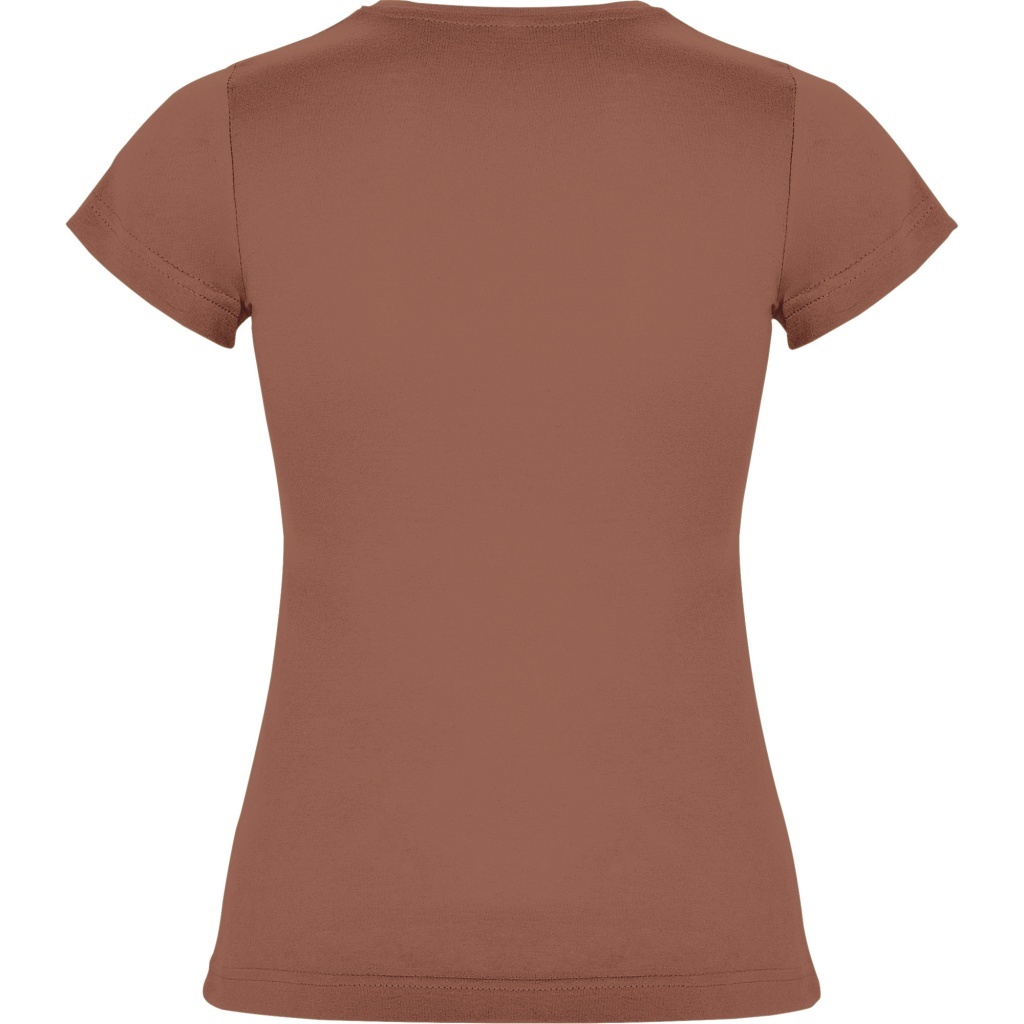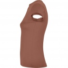 Dopasowana koszulka damska. Zaokrąglony, dwuwarstwowy ściągacz przy szyi, typowo damski fason. Wzmocnione, kryte szwy przy kołnierzyku i na ramionach, szwy boczne.