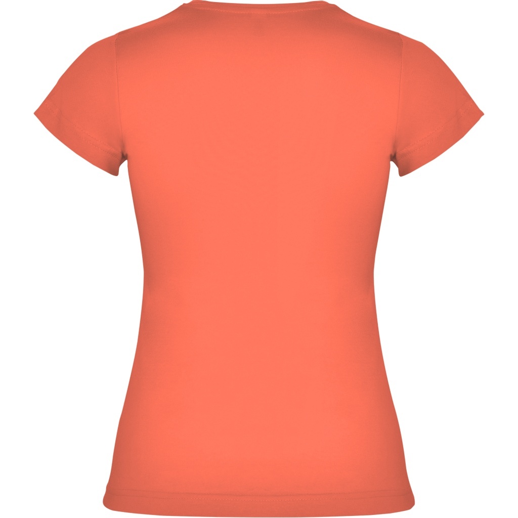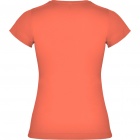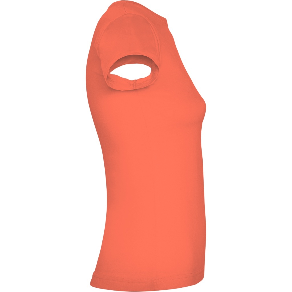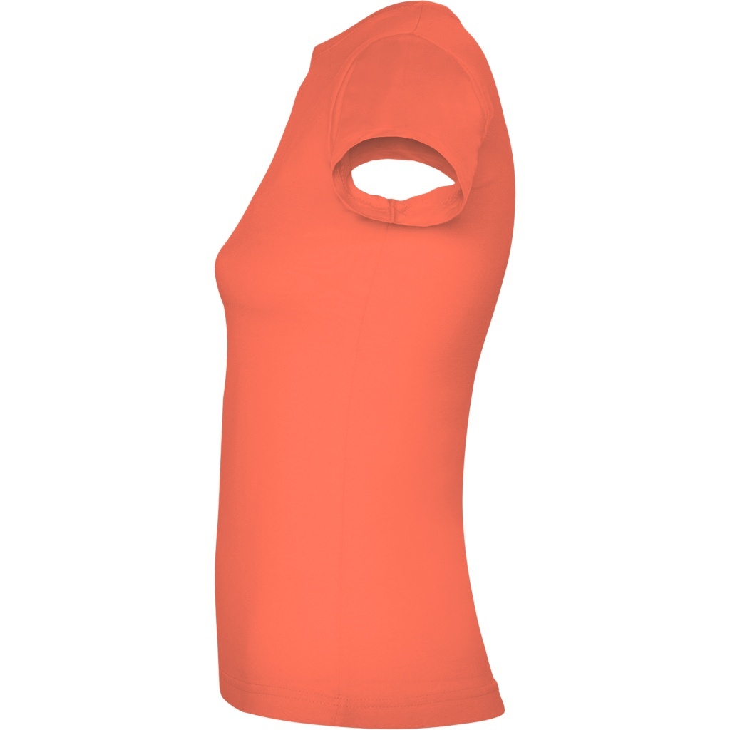 Dopasowana koszulka damska. Zaokrąglony, dwuwarstwowy ściągacz przy szyi, typowo damski fason. Wzmocnione, kryte szwy przy kołnierzyku i na ramionach, szwy boczne.