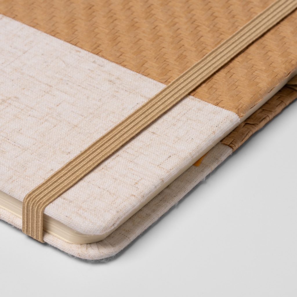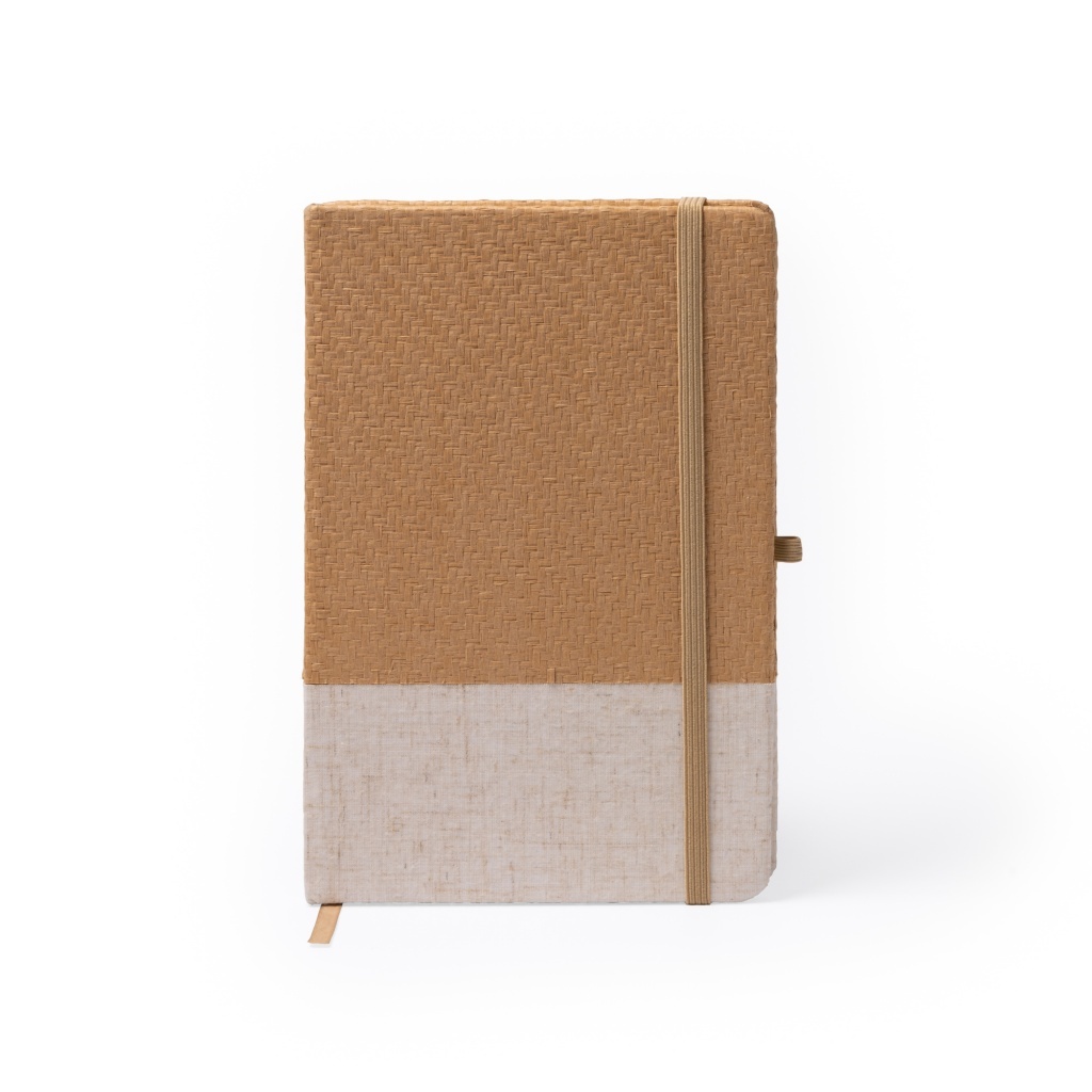 Notatnik formatu A5 z twardą okładką wykonaną z naturalnej słomy i bawełny. Wyposażony w dopasowaną zakładkę oraz gumkę zabezpieczającą. Zawiera 80 kartek w linię.