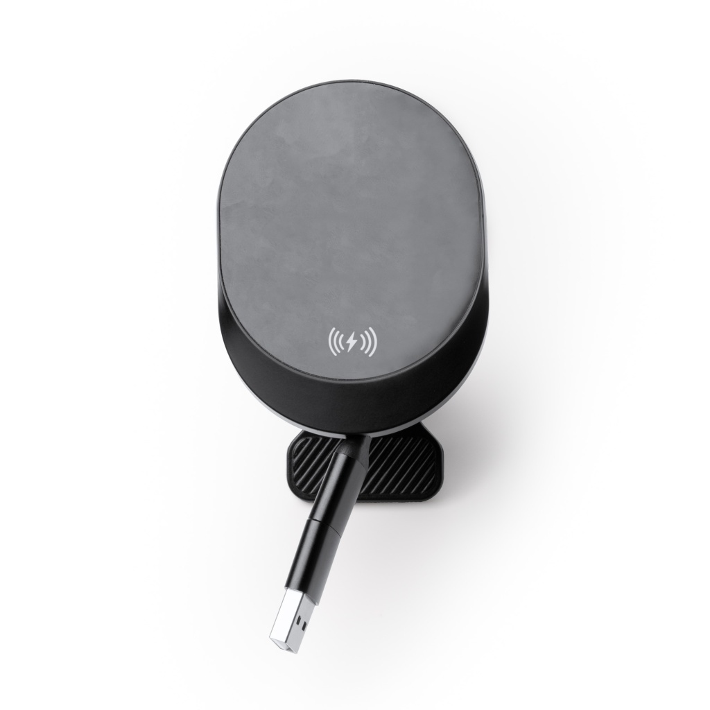 Samochodowa ładowarka bezprzewodowa do smartfonów o maksymalnej mocy wyjściowej 15 W, wyposażona we wsuwany kabel USB typu C z adapterem USB. W zestawie znajduje się pierścień magnetyczny.