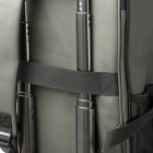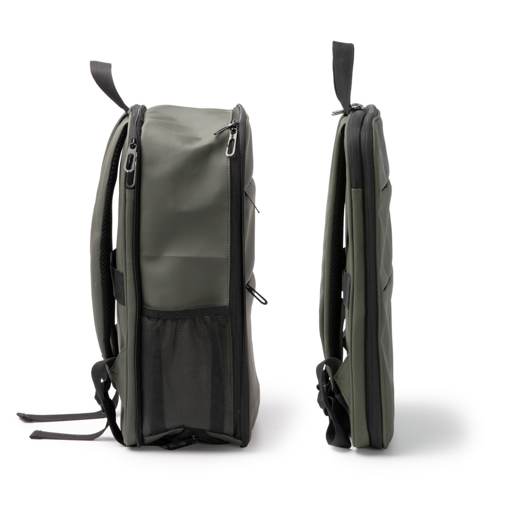 Plecak z ekologicznej skóry PU, wyposażony w dwie komory — obie zamykane podwójnym zamkiem błyskawicznym. Jedna komora jest wyściełana i przeznaczona na laptopa o przekątnej do 15 cali. Druga, rozciągana na zamek, zawiera kieszeń z elastycznym ściągaczem, przeznaczoną do bezpiecznego przechowywania innych urządzeń.