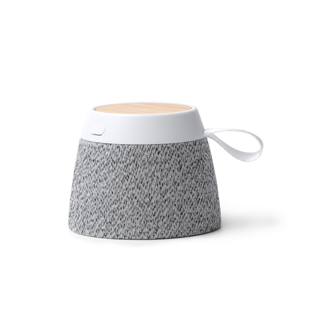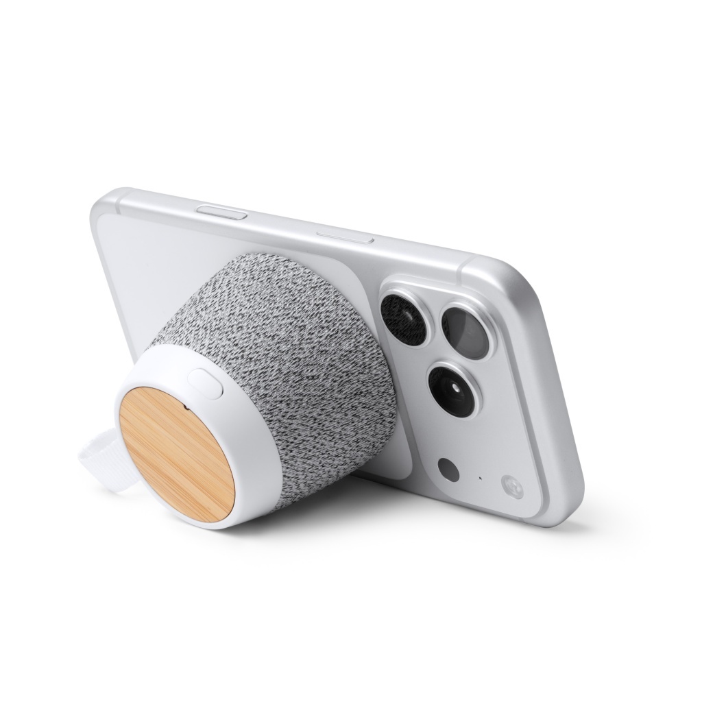 Bezprzewodowy głośnik o obudowie z bambusa i tkaniny RPET, z mocą wyjściową 5 W oraz baterią 300 mAh. Odtwarzanie przez Bluetooth, wbudowana funkcja głośnomówiąca oraz pierścień magnetyczny pełniący rolę stojaka na smartfona, co zwiększa uniwersalność zastosowań.
