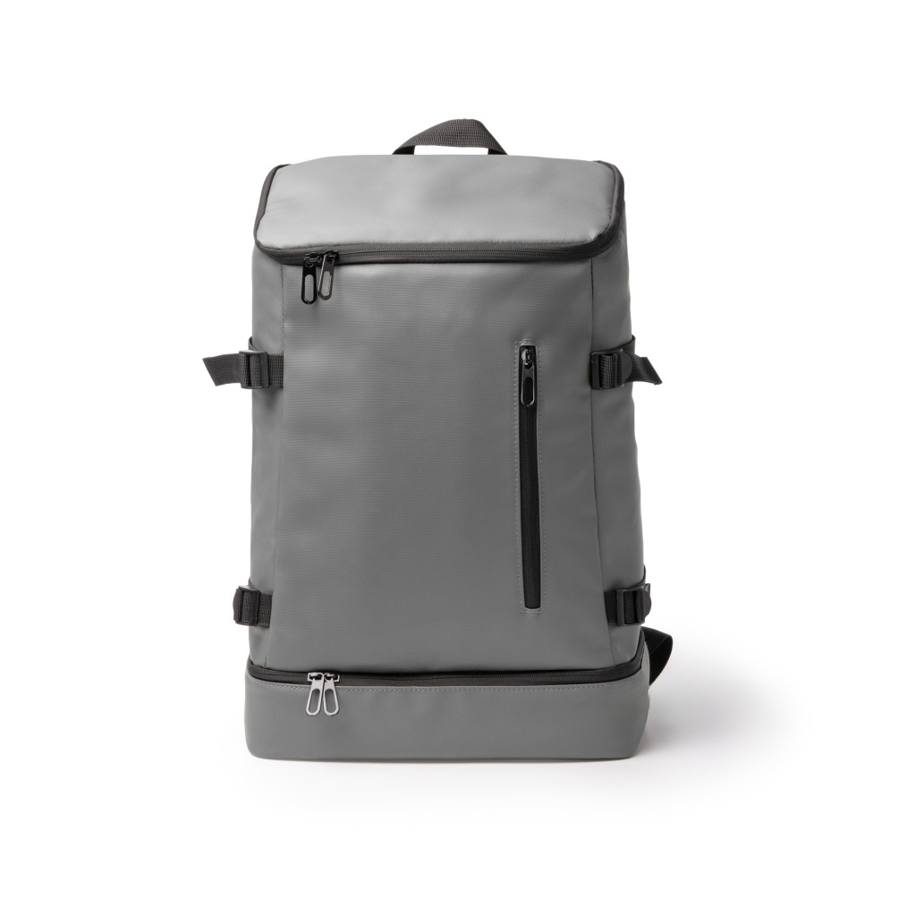Izotermiczny plecak z wykończeniem ze skóry PU, wyposażony w główną komorę z izotermicznym wnętrzem i górnym otwarciem oraz dolną komorę dodatkową również z izotermicznym wnętrzem i pełnym otwarciem. Obie komory zamykane są podwójnie za pomocą zamków błyskawicznych. Plecak posiada obszerny panel przedni, boczne klamry dla lepszego dopasowania oraz wyściełane plecy i szelki zapewniające wygodę.