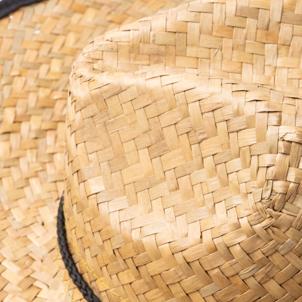 Kapelusz z naturalnej słomy, z poliestrowym wzmocnieniem wokół brzegu i regulowanym ściągaczem od góry, dopasowanym kolorystycznie do wykończenia.